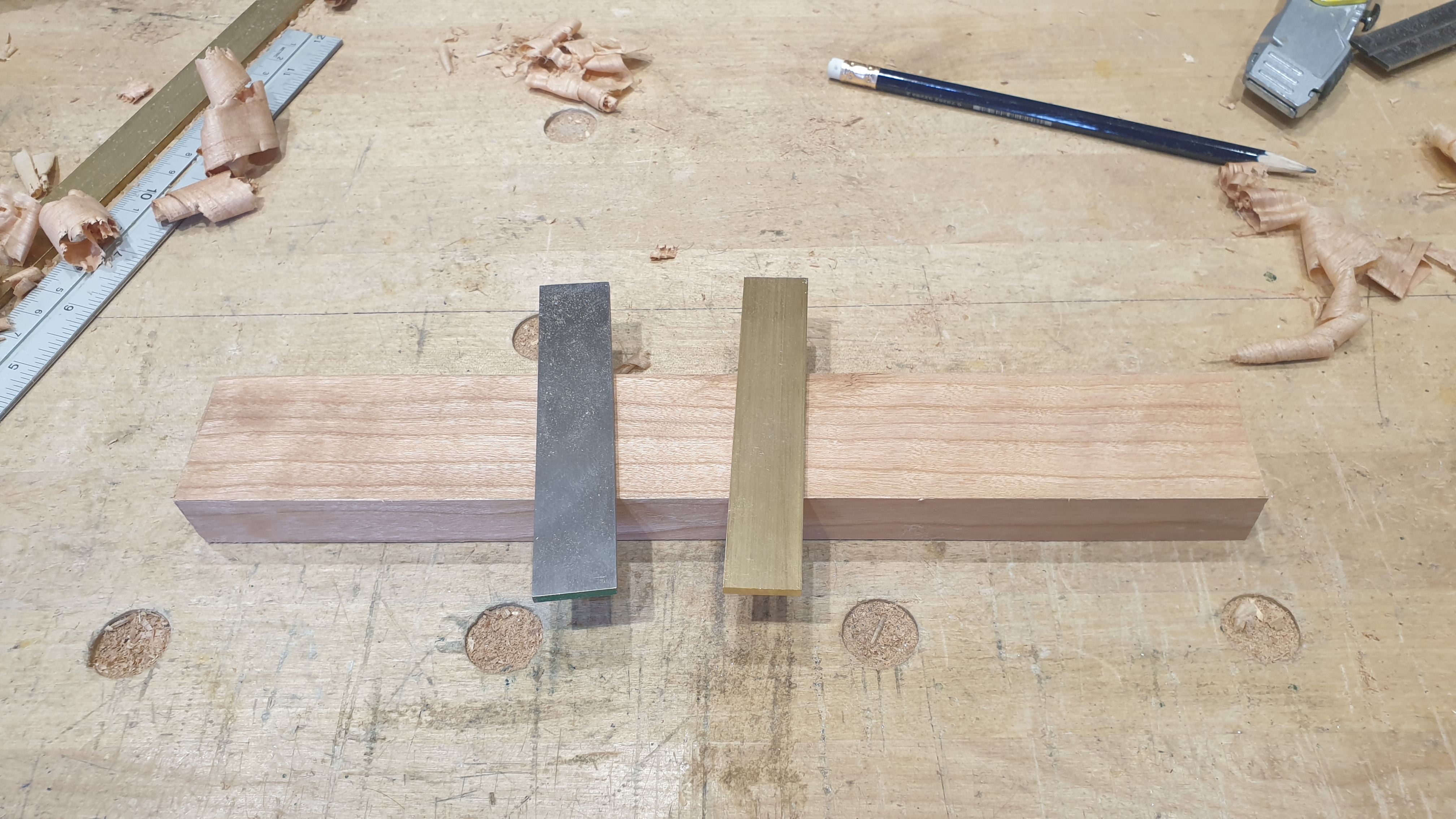 One piece of wood, some flat stock 01 tool steel and a piece of brass